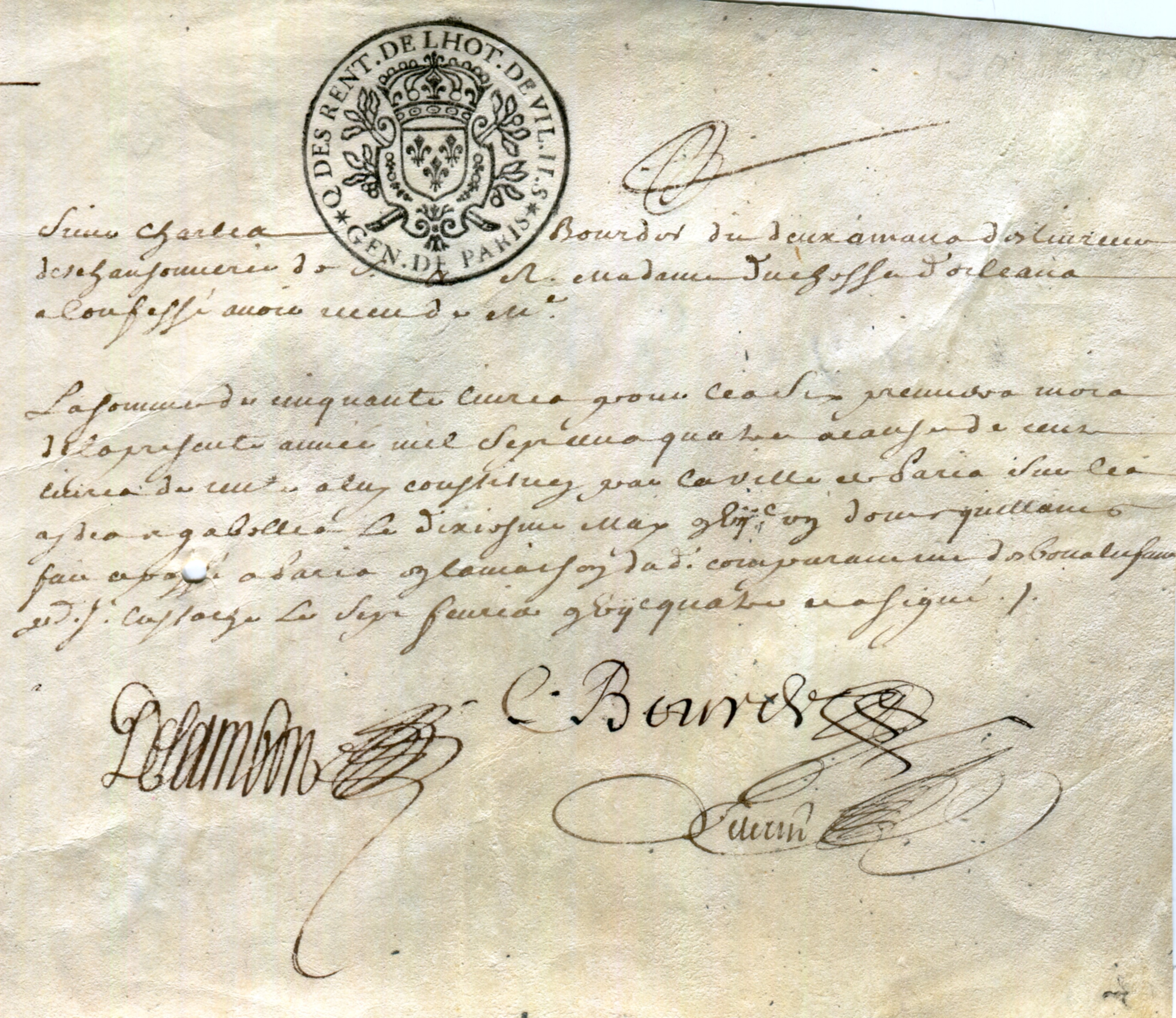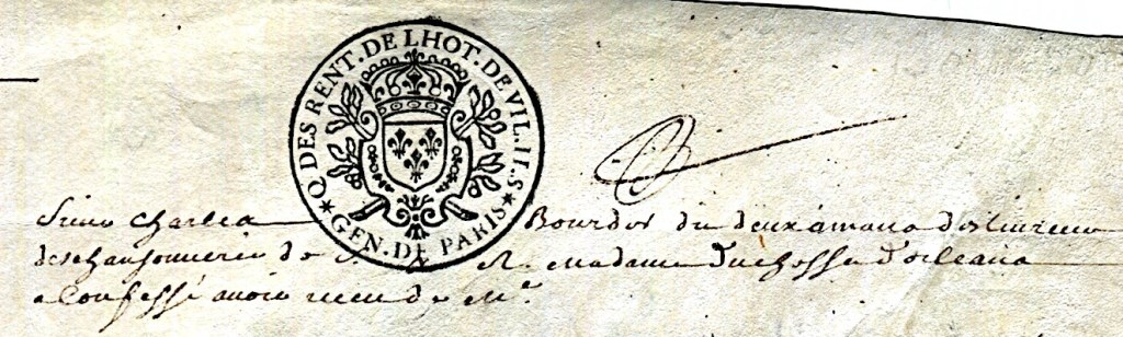 Le papier timbré est l’ancêtre du timbre fiscal. Malgré des débuts homériques, Louis XIV a imposé cette nouvelle taxe sur les documents notariés et les actes d’état civil. Sans timbre un acte ne peut être produit lors d’une procédure de justice. À partir de 1791, s’ajouteront divers filigranes tandis qu’en 1801, une seconde marque à sec ou embossée compléteront le manuscrit. Ce qui nous oblige à considérer le document dans son entier comme étant un ‘papier timbré’.