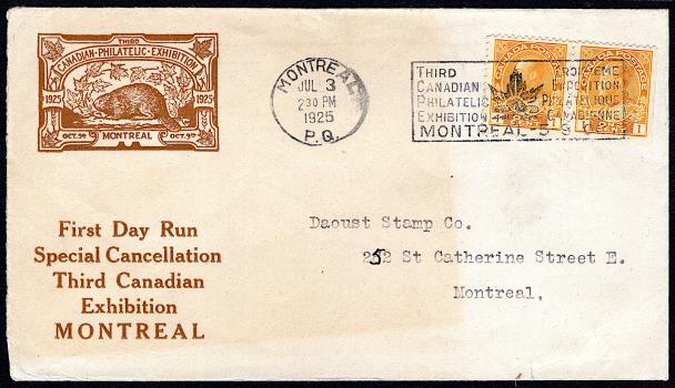 Un peu plus tard, j’obtiens un pli avec un timbre Amiral du 3¢ carmin. Comme d’habitude, j’étudie le timbre à la loupe pour confirmer qu’il n’a ni réentrée, ni retouche. Par hasard, je remarque la flamme attrayante faisant la promotion de la « troisième exposition philatélique canadienne » tenue à Montréal du 5 au 9 octobre 1925. Curieux, je commence à me poser des questions. Que s’est-il passé lors de cette exposition? Qui exposait et quels types de collections étaient présentées? Quels étaient les philatélistes importants de l’époque? Les marchants? Les sociétés philatéliques? Les publications philatéliques? Bref, quel était l’état de la philatélie à l’époque de la série des timbres Amiral?