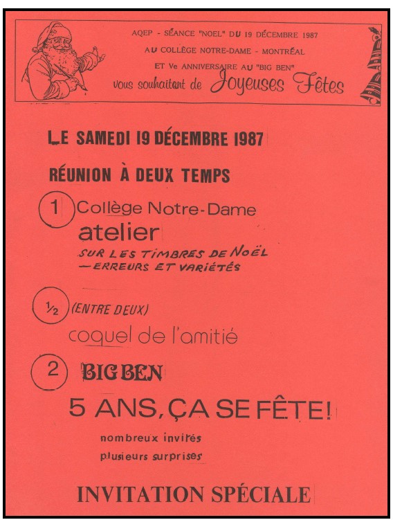 Le 19 décembre 1987, notre réunion mensuelle débuta par un atelier sur les erreurs et variétés des timbres-poste canadiens de Noël, au Collège Notre-Dame, suivi d’un coquetel de l’amitié offert par l’Académie à ses membres. Une petite marche nous amena ensuite à la brasserie Big Ben, 6635 chemin de la Côte des Neiges, où une réception, suivie d’un dîner de gala, rassembla les membres de l’Académie québécoise d’études philatéliques et leurs conjoints ainsi que des anciens de l’AQEP, des membres honoraires ou correspondants, des représentants de la Société canadienne des postes et de nombreux amis de l’AQEP qui avaient été invités. C’est à cette occasion que fut lancée la première édition des Éphémérides de l’AQEP, œuvre compilée par Michel Gagné.