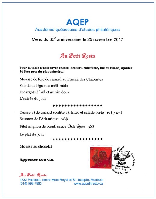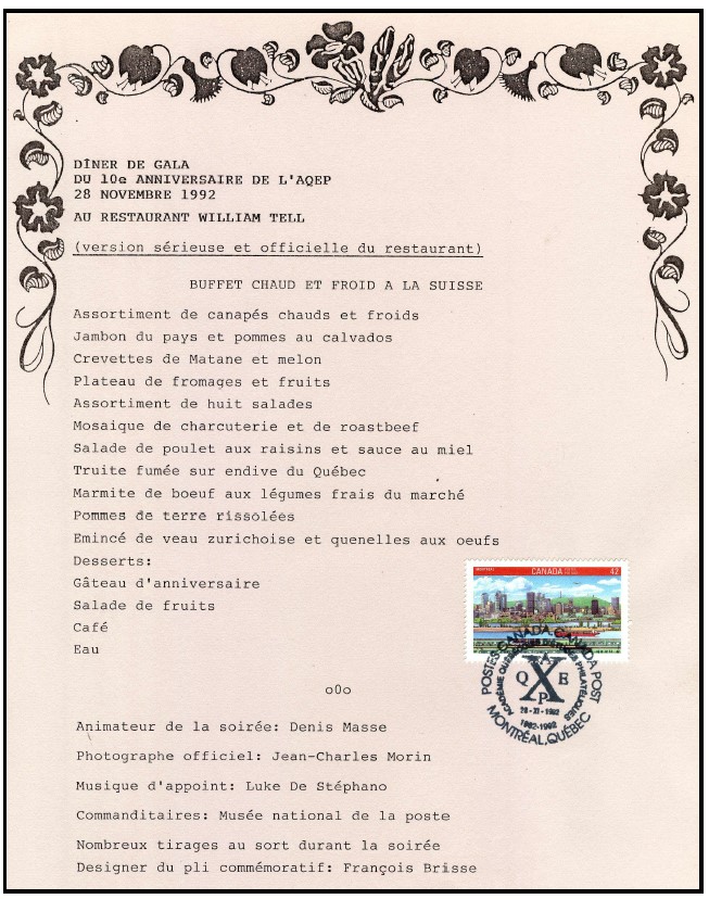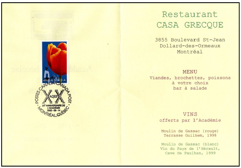 Pour le dîner du XXe anniversaire de l’Académie québécoise d’études philatéliques, nous nous retrouvons au restaurant « Casa grecque », 3855 boulevard Saint-Jean, à Dollard-des-Ormeaux. C’est l’Académie qui offrit le vin, lors du dîner de gala à ce restaurant du genre « Apportez votre vin ». Le pli souvenir, cette année-là, voulait marquer les liens étroits entre l’AQEP et l’AEP.