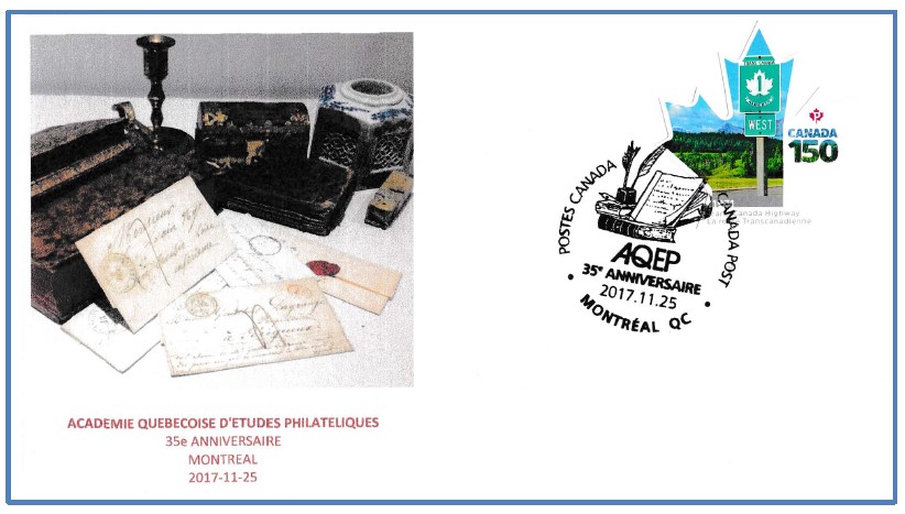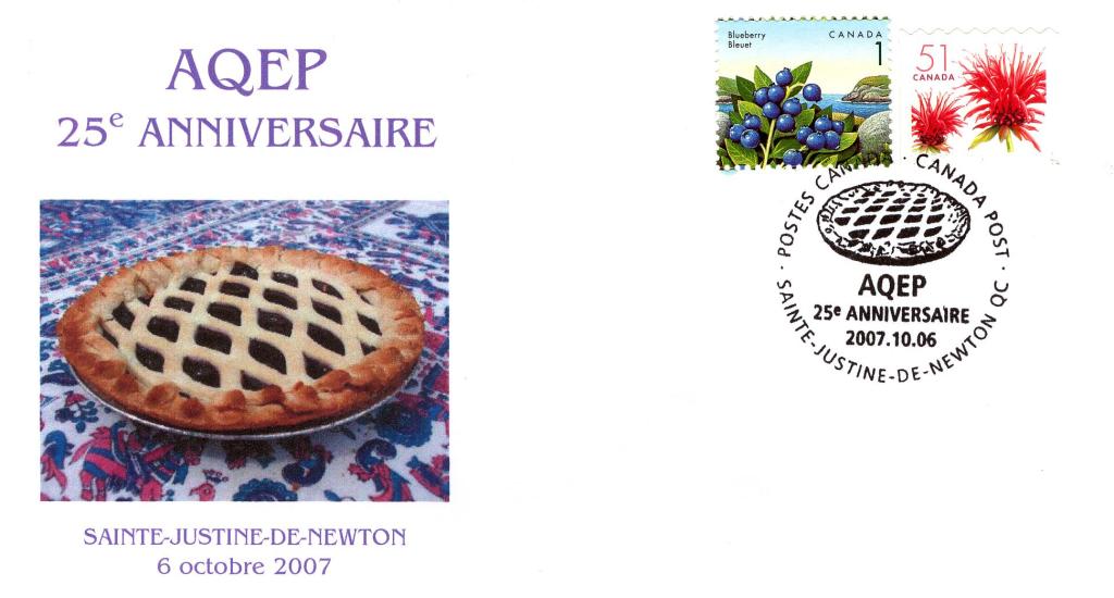 Le second pli est oblitéré de Sainte-Justine de Newton, pour rappeler la réunion initiale autour d’une tarte aux bleuets, où naquit l’idée la création de l’Académie québécoise d’études philatéliques.