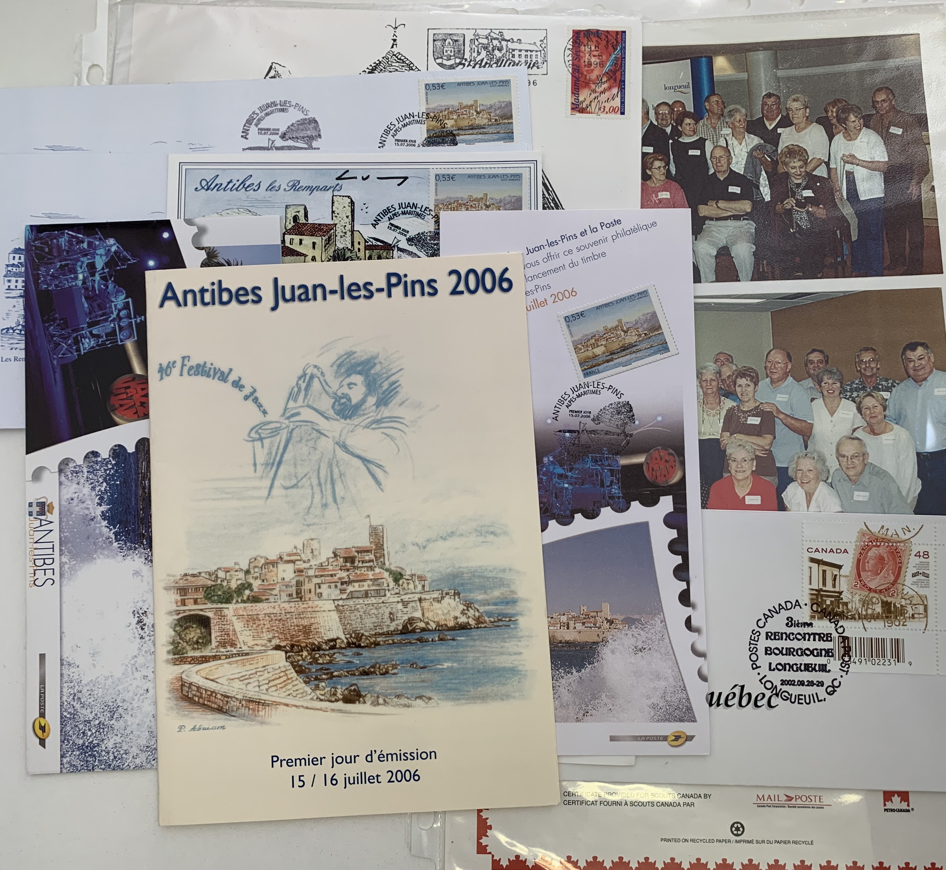 | 209 | QUÉBEC-ANTIBES | Dossier contenant les programmes et souvenirs de la 1ère rencontre philatélique d’Antibes et la Société philatélique de la Rive Sud de Longueuil en octobre 2004 + Célébration du jumelage Franco-Québécois de septembre 2000 + Rendez-vous Bourgogne-Québec en 2002 Contient photographies, PPJ sur carton, | 15$ | ![]() |
